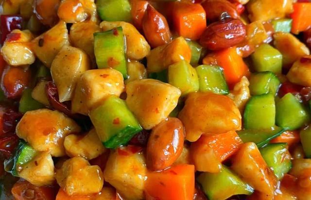 5、炒香以后,再倒入熟花生米和青瓜丁一起翻炒,接着淋入调好的酱汁一起翻炒收汁,即可出锅开吃。