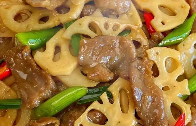 4、接着倒入莲藕一起翻炒均匀,再加入食盐、白糖和蚝油调味提鲜,然后继续翻炒均匀入味,即可出锅开吃。