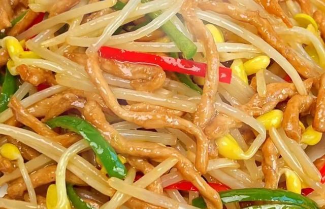 准备食材: 瘦肉、黄豆芽、青红椒丝、蒜末。