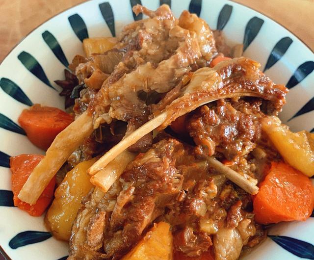 5. 放入胡萝卜和洋葱继续炖20分钟,最后开大火收汁,撒上香菜即可。重点来了:一定要加热水炖煮,冷水会使羊肉纤维收缩变硬!