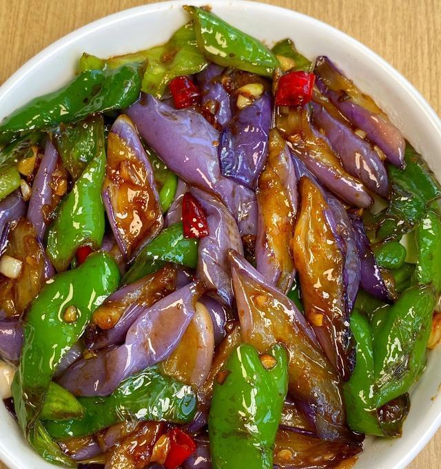 5、大火翻炒1分钟,使茄子充分吸收调料,颜色油亮入味,关火盛出装盘即可。