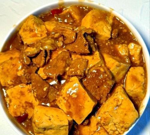 4、锅中继续倒油,油热放蒜末、小米辣炒香,倒入酱汁煮开,放入煎好的豆腐,扣盖焖煮2分钟,淋入水淀粉勾芡,大火收汁撒上葱花即可。