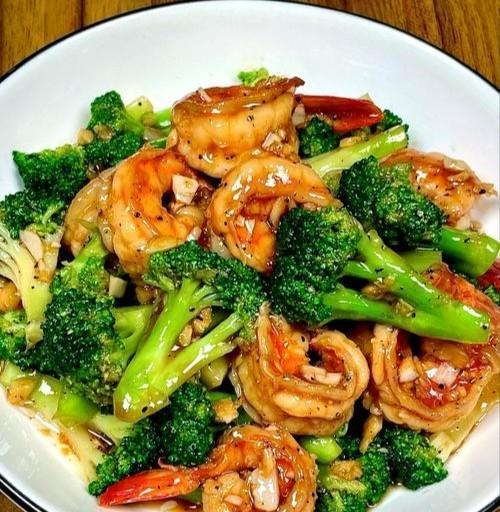 4. 加入虾仁翻炒至变色,加入西兰花继续翻炒,加盐调味即可。