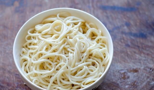 铁锅大火烧热一锅水,倒入切好的生姜沫,再倒入150克面条。用筷子搅拌几下,盖上锅盖。先煮3-4分钟。开盖!加入适量清水,用筷子搅拌几下。盖上锅盖,小火,直至再次水开面滚。熄火!焖煮30秒。开盖!用筷子将全部面条捞入面碗(碗底事先放一勺半食用油)。