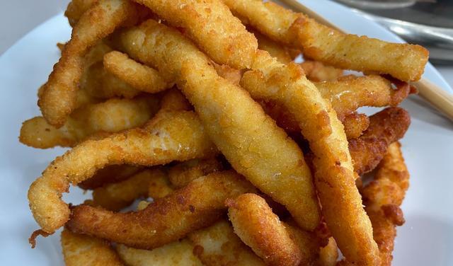 2、油温继续加热,放入鸡柳复炸一遍,这一遍需要将它炸上色,复炸过的鸡柳吃起来外皮是更酥脆的。
