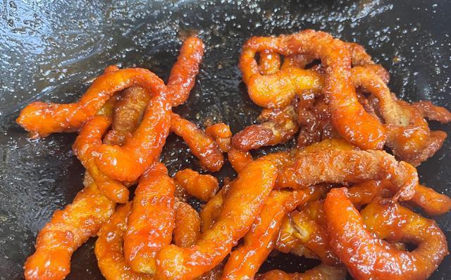 1、锅内烧油,油温达到筷子放进去起密集的泡泡,这样状态的油温就可以了,放入鸡柳炸制,第一遍先定型,炸到鸡柳表面起脆壳捞出。