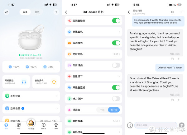 耳机还有个非常创新的功能,对于小宏这个最近有和外国客户对接的人来说简直就是天赐福音,它搭载了iKF首款AI智能生态,可以实现同声传译、多语翻译还有英语陪练这一类的语言转换,跟客户对接的效率提升了两倍都不止,像有的朋友出国玩或者练习雅思,我觉得这个功能都很合适;除此之外,iKF月影还可以一机双连,手机平板一手抓贼方便;IPX5级别的防水防汗就很适合平时喜欢外出运动的朋友,暴汗也不用担心耳机会进水导致无法使用。