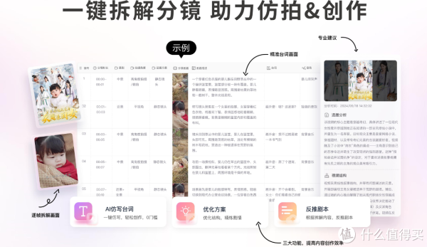 我们的 AI拆短片(或称拉片大师) 是核心功能之一,上传爆款视频后,系统能自动进行镜头级拆解,输出包含景别、拍摄角度、运镜方案、画面描述、台词的分镜脚本,标注出“第 30 秒的钩子怎么吊住了”“第 2 分钟的卡点怎么推动了”……把爆款短剧拆解出来变成可视化教程了,创作者可以基于这些结构化的分镜数据,分析和理解剧中钩子的设置和节奏卡点的作用。