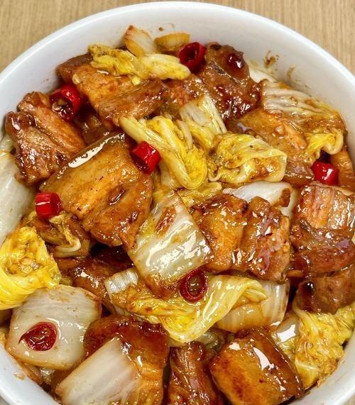 4. 待娃娃菜变软,加入一勺生抽和一勺蚝油调味,翻炒均匀即可。娃娃菜会吸收五花肉的油香,变得异常鲜美下饭。