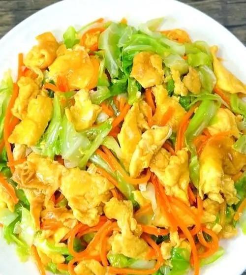 3、锅中继续倒油,油热放葱花、蒜末爆香,放包菜丝大火翻炒至软,放胡萝卜丝翻炒,调味加蚝油、生抽、老抽、白糖、盐,翻炒入味,倒入鸡蛋和葱花,翻炒均匀即可。