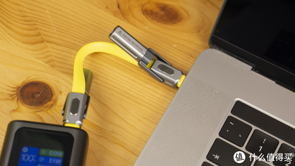 我们把两端的功能部分拉开,就可以看到里面的双Type-C接口了。虽然线缆不长,但它依旧是一根高规格的,支持240瓦PD3.1快充的充电线。不但可以为我们的手机快速补充电能,还可以满足轻薄本的补电需求。