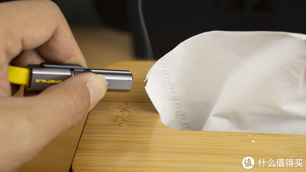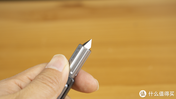 在它的另外一侧通过旋转,我们可以看到,它里面内藏了一个钛合金的刀头,非常的尖。它的长度约在5毫米左右,用它划开包装箱,通常不会对里边的物品造成什么伤害。