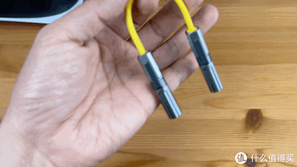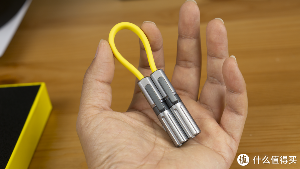 这根数据线看起来还是非常精致的,它的大小也就跟一个普通的一次性打火机差不多。黄色的连接线质感满满,它的两端分别有两个合金的附带磁吸的接口。