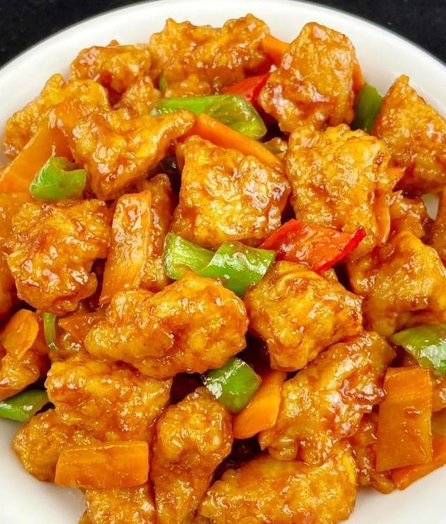 4. 溜炒: 锅里留底油,下青椒胡萝卜片炒一下,倒入碗汁煮至粘稠,然后倒入炸好的肉段,快速翻炒裹汁即可。外酥里嫩,酸甜可口,是东北菜的经典代表。