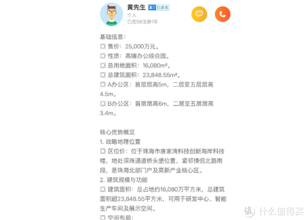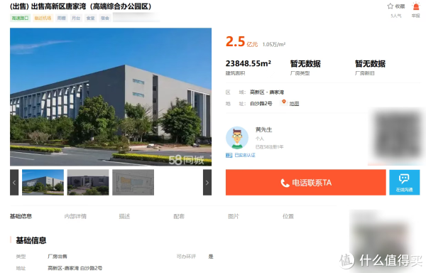 58同城显示,位于珠海市高新区唐家湾一处高端综合办公园区正在出售,发布人为黄先生,总面积为23848.55 m²,标价2.5亿元。