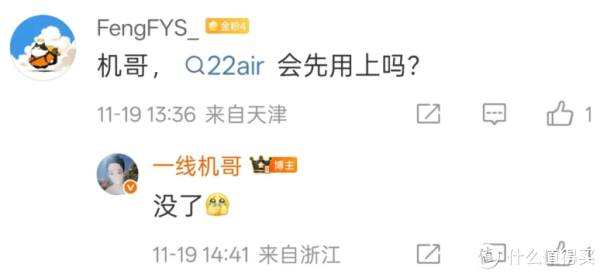 随后,当有网友问起知名魅友一线机哥魅族22 Air是否会先上时,该博主仅回复了两个字:“没了!”