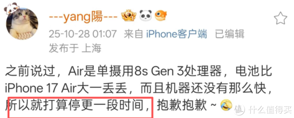 有透露,魅族Air是后置单摄方案,搭载的是骁龙8s Gen3处理器,电池比iPhone 17 Air大一丢丢。”
