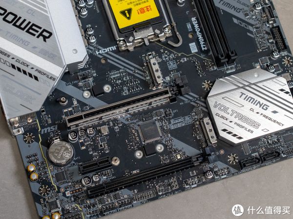 扩展方面,主板配备1条直连CPU的PCIe 5.0 x16全速插槽,带有金属加固;另提供1条PCIe 4.0 x4与1条PCIe 3.0 x1插槽。存储方面配备两个PCIe 4.0 x4 M.2接口,均覆盖冰霜铠甲,其中直连CPU的接口还支持免工具快拆,兼顾速度与便捷。