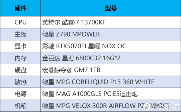配置围绕英特尔酷睿 i7-13700KF 处理器与微星 Z790 MPOWER主板进行搭建,搭配影驰RTX 5070Ti 星曜 NOX OC 显卡、高频DDR5内存,并融入微星全家桶的机电散组合,是一套兼具出色游戏帧率与多线程能力的全能型方案。