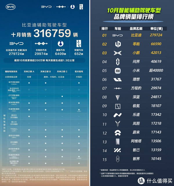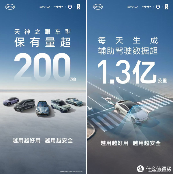值得注意的是,在销量创下新高的同时,比亚迪智驾销量突破新纪录!截至10月底,搭载“天神之眼”辅助驾驶系统的车型累计销量已突破200万辆,日均生成的智能驾驶数据里程更是超过了1.3亿公里。要知道,这可是比亚迪于今年年初才发布的辅助驾驶系统,如此之快的增长速度,堪称行业奇迹。