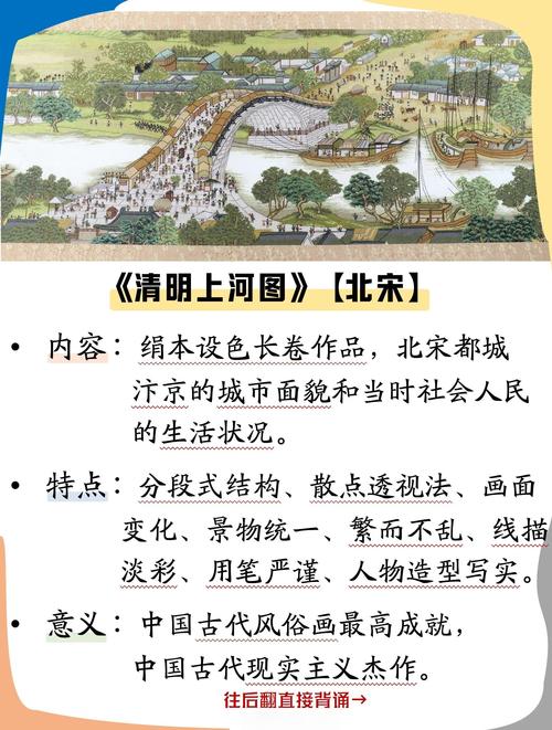 这幅画作因其强烈的艺术感染力、深刻的社会意义和浓厚的爱国主义精神,实现了艺术美与思想深的完美结合。②:《清明上河图》展现了汴京清明时节的繁华景象,不仅反映了当时城市的繁荣,也体现了北宋时期的城市经济状况。透过这幅画作,我们能够了解北宋都市的风貌和不同社会阶层的人民生活。