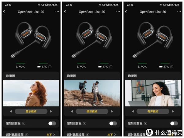 它不仅能提供出色的基础听感,还能通过智能音效模式进一步优化不同场景下的体验。 通勤时用音乐模式,低音更突出;接工作电话时切人声模式,对方的声音更清晰;跑步时开锻炼模式,节奏更明快。我还试了空间音效,听有声书时,旁白的声音立体环绕,代入感特别强。