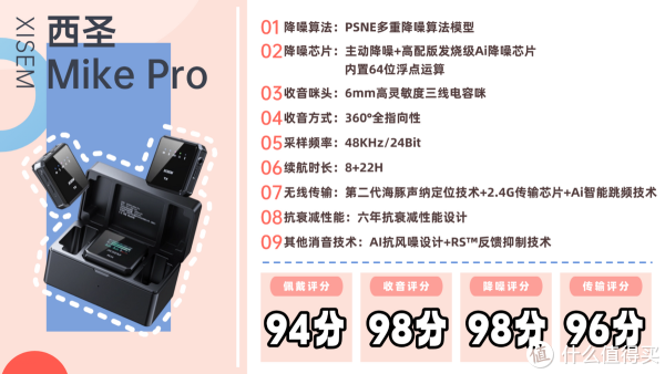 西圣Mike Pro在核心技术上实现双重突破:一方面,摒弃业内普遍使用、易残留环境噪音的普通收音方案,坚持成本更高、技术难度更大的360度全指向AI感知麦克风,结合第二代ALPT高密度拾音技术,将声音分层分段捕捉,从源头提升声音细节,让声音清晰度提升98%;另一方面,采用行业首创的PSNE四重降噪算法模型,配合发烧级Ai降噪芯片和自研RS™反馈抑制技术,精准过滤环境噪音并消除回声啸叫,将抗噪性提升至96%。在信号传输与兼容性上,它搭载第二代海豚声纳定位技术,配合升级的2.4G传输芯片,实现200米内稳定传输且延时低至20ms;同时兼容市面上99%的相机、手机、平板和电脑,搭配充电仓续航可达30小时,确保长时间专业级录音不间断。西圣Mike Pro也非常适合预算有限但拒绝音质妥协,追求“百元价格、千元性能”的全体内容创作者。