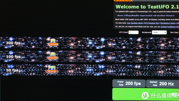 除了2K的超清画质之外,它的原生最高刷新率达到了200Hz。为了验证其真实性,我们也使用了TESTUFO,对其进行了简单的测试。从上面的截图中我们可以看出,这款经济路线的显示器确实没有虚标。