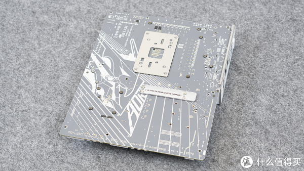 主板的背面,也同样使用了浅灰配色,在CPU、显卡卡槽位上,还使用了全金属的强化件。