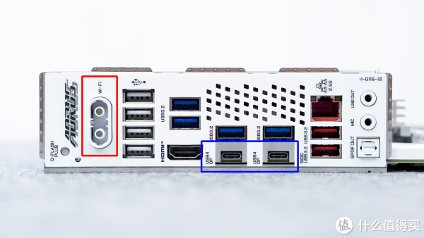 这是技嘉X870的IO接口,从左到右分别是Q-FLASH PLUS按键、红圈里面是磁吸快拆设计的Wifi7天线、四个USB2.0、四个USB3.2(5Gbps)、一个HDMI、两个USB4(40Gbps)、两个USB3.2 Gen2(10Gbps)、一个2.5G网口、一个音频光口、一个Mic口和一个Line Out接口。从配置上来讲,这也是完全够用的。