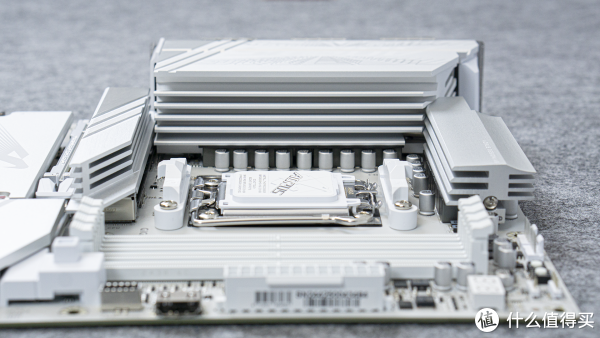 技嘉X870冰雕使用了16+2+2相的供电设计,且覆盖了大规模的铝制散热装甲,与传统的散热片相比,它的表面积显然要大得多。从散热装甲的侧面, 我们还可以看到直径约8mm的热管。这样的散热系统,完全可以承载系统高功率使用的要求。