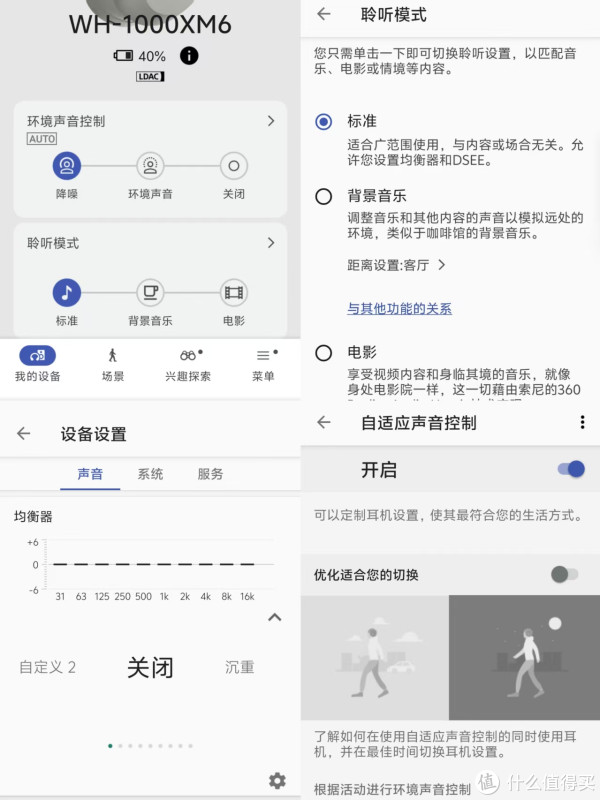 从早期的Headphone Connect APP到如今的Sound Connect APP,界面始终美观,功能不断完善,除了能够手动切换降噪/环境声音/关闭,还支持10段式自定义均衡器,以及游戏模式。语音控制、头部姿势控制、快速关闭/开启麦克风等新玩法的加入,则是让这台XM6的智能化定义达到了更高的水准。