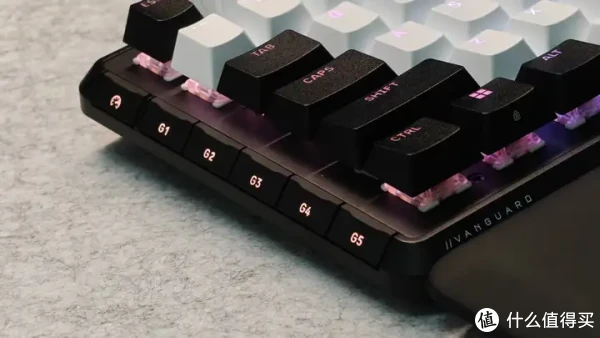 键盘最左侧的6颗G键从原来的悬浮式按键挪到了外壳边框上,极大改善了原先可能误触的问题,最上面的G键可以一键切换键盘模式,G1-G5则可以在驱动内进行自定义功能。