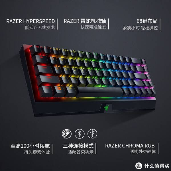 然而,“迷你”绝不意味着性能的妥协。这款键盘提供了无线、蓝牙、有线三种连接模式,几乎覆盖了所有使用场景。无线状态下,HyperSpeed技术确保了在激烈游戏中也能实现“零延迟”的稳定传输,告别拖影与断连的烦恼;蓝牙模式则能同时配对三台设备,方便用户在电脑、平板、手机间无缝切换;而有线模式则化身“电竞模式”,保证绝对信号同步的同时,也能边用边充。