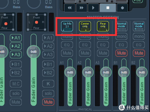 模式方面,A1是2.1模式(Up Mix 2.1),A2是作为中置(Center only),A3是后置(Rear only)。