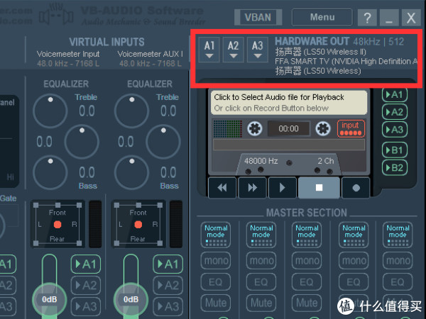 Vociemeeter的模式比较多样,如果不想电视作为中置,可以A1为KEF LS50无线二代(Normal模式),A2是KEF KC62低音炮(LFE Only模式),A3是KEF LS50无线初代(Rear only模式)。
