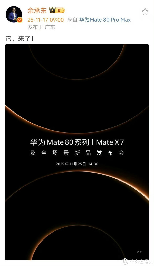 华为 Mate 80 系列和 Mate X7 折叠屏将在 11 月25日正式亮相,值得注意的是华为Mate 80 Pro+正式改名。