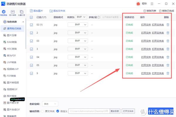 系统会自动转换文件格式,等待几秒、当转换状态显示‘已完成’,打开文件或文件夹就能查看转换后的bmp图片文件。