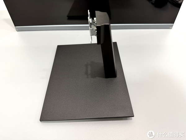 底座是极简的 “L” 型设计,厚度仅 1.5cm,放在桌面上几乎不占垂直空间。组装也是超级简单 —— 不用螺丝刀,把底座对准显示器底部的卡槽,“咔嗒” 一声卡紧,再轻轻一推固定,2分钟就装好了,非常简便。
