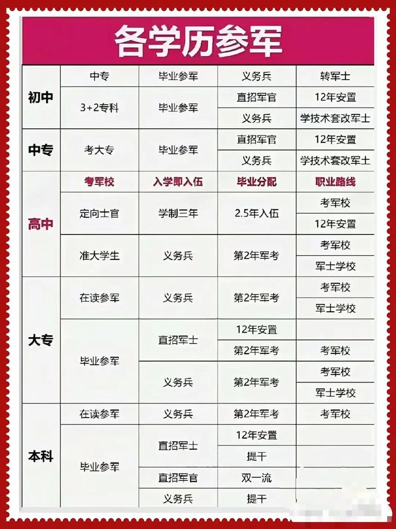 初中生与高中生在当兵条件上存在差异。首先,初中学历者要参军必须满足两个条件,一为农业户口,二是年满18至20周岁,才能通过审核参加兵检。相比之下,高中学历者则较为宽泛,只要年满17至22周岁,就能进行初步审查,参加兵检。这反映出学历对参军条件的影响,学历越高,参军门槛相对越低。