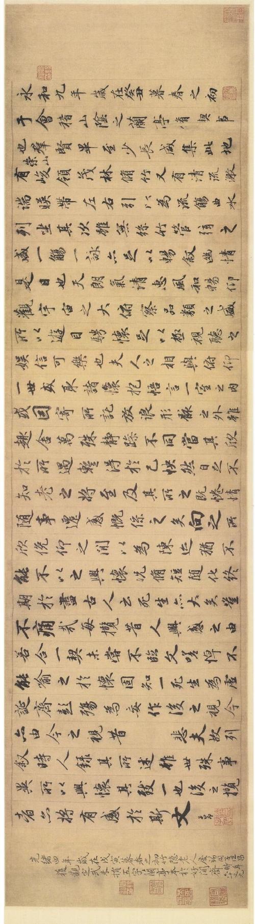 存世唐摹墨迹以“神龙本”为最著,唐太宗时冯承素号金印,故称为《兰亭神龙本》,此本摹写精细,笔法、墨气、行款、神韵,都得以体现,公认为是最好的摹本;石刻首推“定武本”。