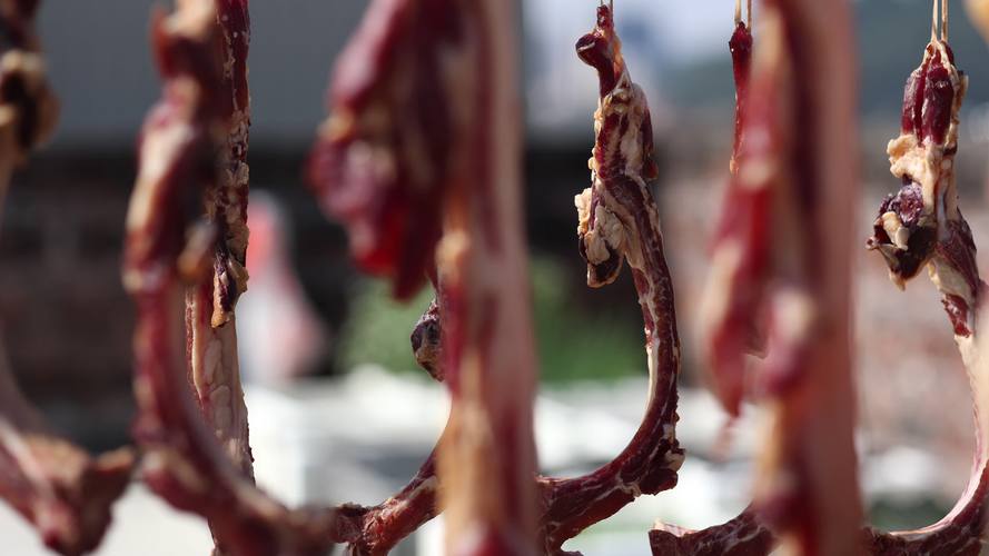 把腌制好的兔子肉平放在案板上,肚腹朝下,将前腿扭至面前,用重物将其压平,撑开成板形,定形必然工夫后,挂阴凉通风处晾干,普通7~10天即能够成为干品。假如是赶上阴雨天色的话,那么也能够用炭火来烤。