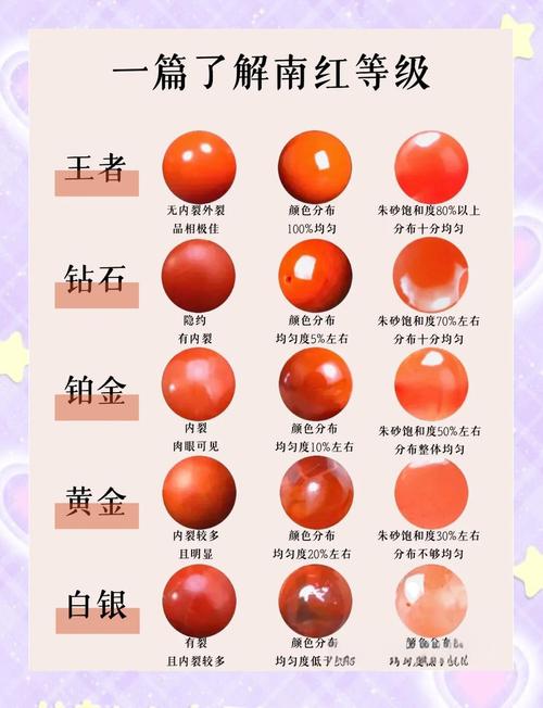 4、根据其颜色、质地、纹理等因素,南红玛瑙可以分为不同的档次,其中极品南红玛瑙数量稀少,品质极高,价格也非常昂贵。一级品、二级品南红玛瑙虽然品质略逊于极品,但价格相对亲民,也有一定的收藏价值。而三级品南红玛瑙品质较差,价格相对较低。