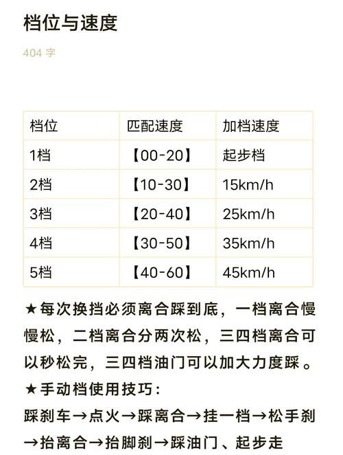 1、科目中档位与速度匹配的技巧:1。起步时,踩下离合器和制动器,松开手制动,换至1档。慢慢松开半悬挂机构的离合器。当你感觉到车在晃动时,离合器不会动。直接松开制动器(在此过程中离合器不能移动)此时,当车向前移动,走出2-3米,感觉车不再晃动。可以松开剩下的离合器(快放),慢慢加油。