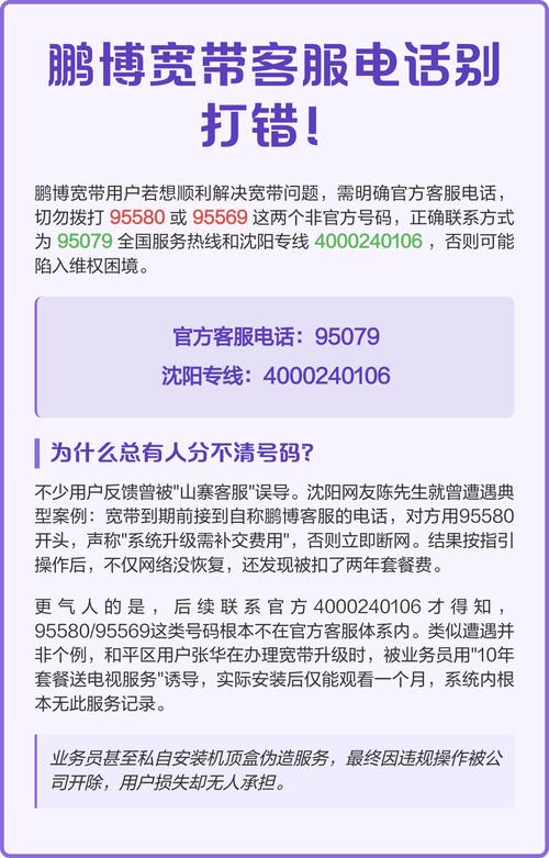2、鹏博宽带不是通过95580或95569进行联系的。以下是关于如何联系鹏博宽带的详细说明:家庭宽带售后(北京)服务电话:95079。如果您是北京地区的用户,并且需要家庭宽带的售后服务,可以拨打此电话号码进行咨询或报修。沈阳地区鹏博宽带客服电话:400-811-2880。