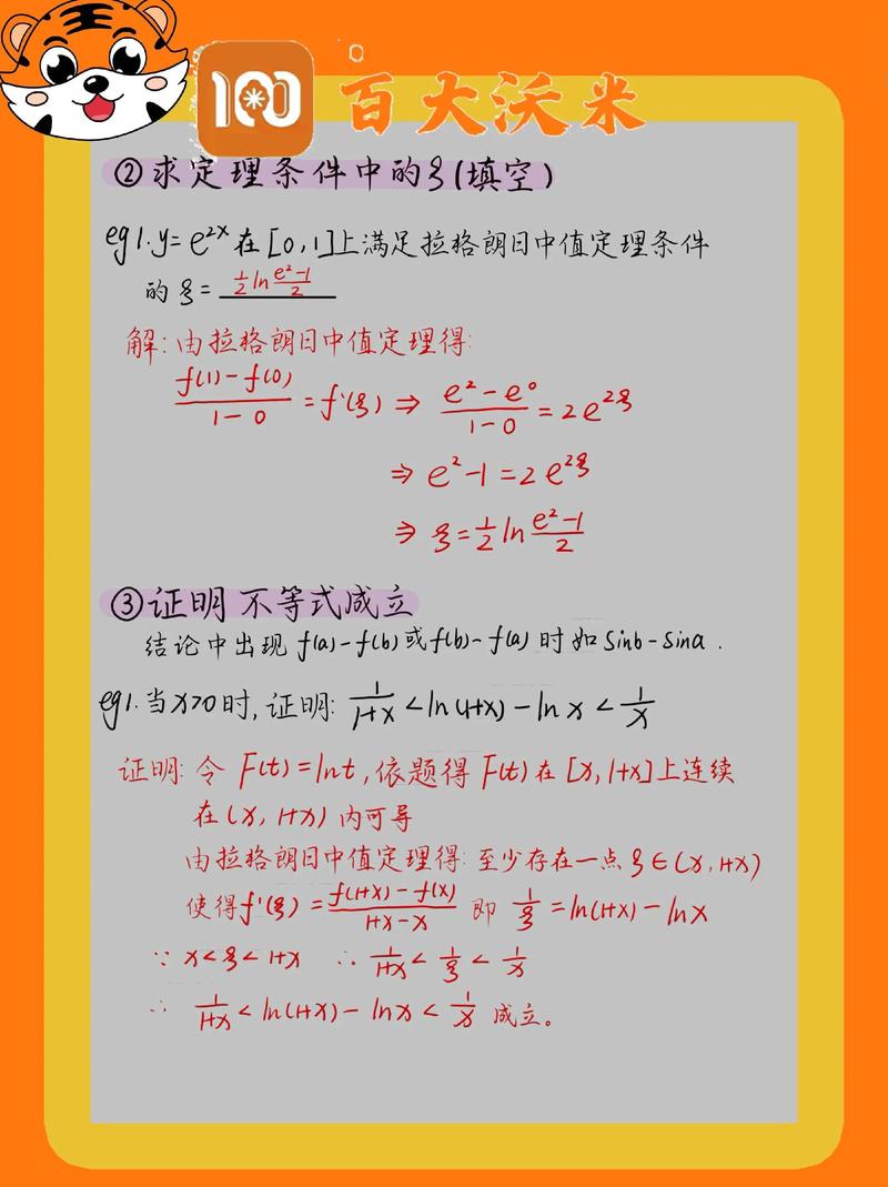 3、-f(1)]/(3-1)=[9-1]/2=4。寻找导数值等于4的x值:f(x)=2x=4,解得x=2。所以,拉格朗日中值定理在x=2处得到了验证,即f(2)=4。通过这个例子,我们可以看到拉格朗日中值定理不仅帮助我们求解平均变化率,还能够帮助我们找到特定点上的导数值,这对于深入理解函数的行为非常有用。