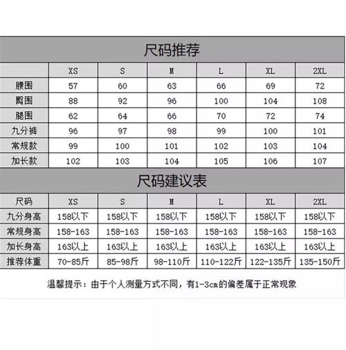 1、S尺码:腰围66-70厘米,臀围86-90厘米,裤长108厘米。 M尺码:腰围70-74厘米,臀围90-94厘米,裤长110厘米。 L尺码:腰围74-78厘米,臀围94-98厘米,裤长112厘米。 XL尺码:腰围78-82厘米,臀围98-102厘米,裤长114厘米。