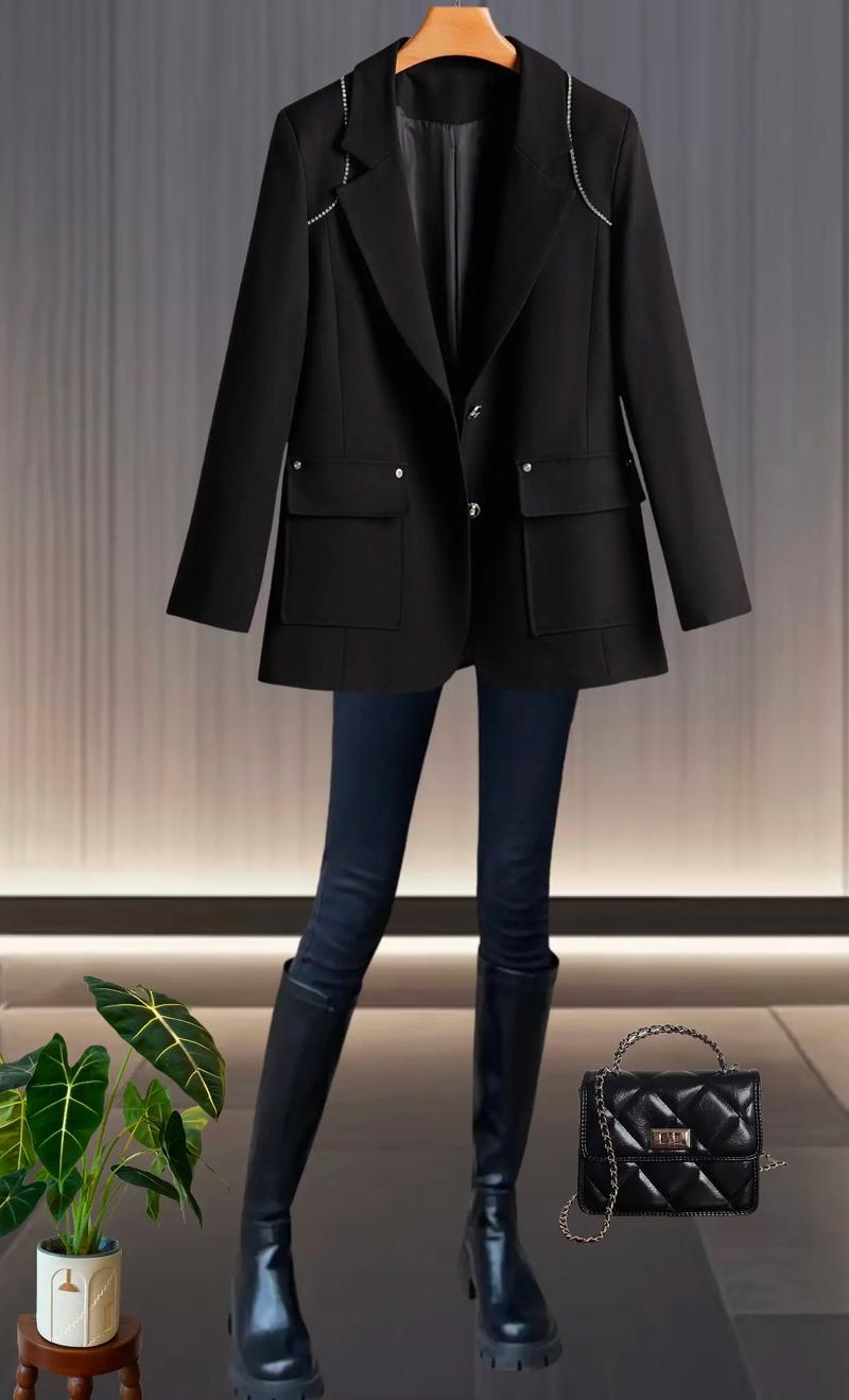 黑色紧身裤:搭配同色系的紧身裤,能够视觉上瞬间拉长腿部线条,这是一种简单易行且不易出错的搭配方法,轻松展现你的大长腿,是春天穿搭的好选择。西裤:黑色外套搭配直筒版型的西裤,即便是宽松的版型也不会显得臃肿,反而展现出时尚与显瘦的效果,是出街时的不错搭配。