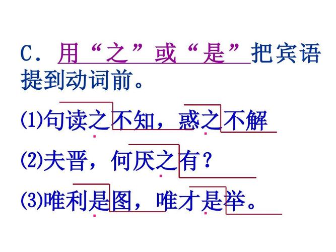 3、表示修饰或领属关系,译为“的”。道之所存,师之所存也:结构助词,用在定语和名词性的中心语之间,相当于现代汉语的“的”。古之圣人:结构助词“的”。宾语前置 句读之不知:宾语前置标志。主谓之间取消句子独立性 师道之不复:主谓间取消句子独立性,无义。