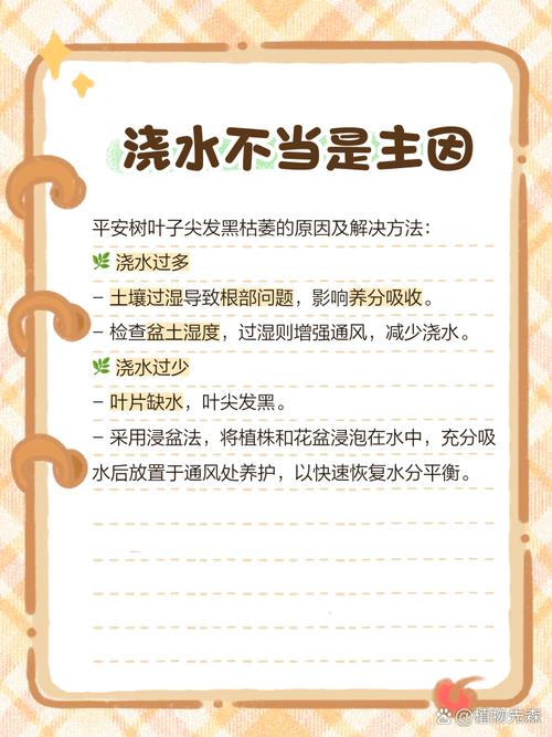 补救方法:停止浇水,对平安树进行松土处理,加强通风,加速水分蒸发。防治病害:原因:感染病害,如褐斑病,导致叶子发黑干枯。补救方法:剪去发病枝叶并烧毁,对植株喷洒多菌灵溶液进行预防,每周一次连续一个月。调整光照:原因:光照过强,特别是夏季强光晒伤叶片。